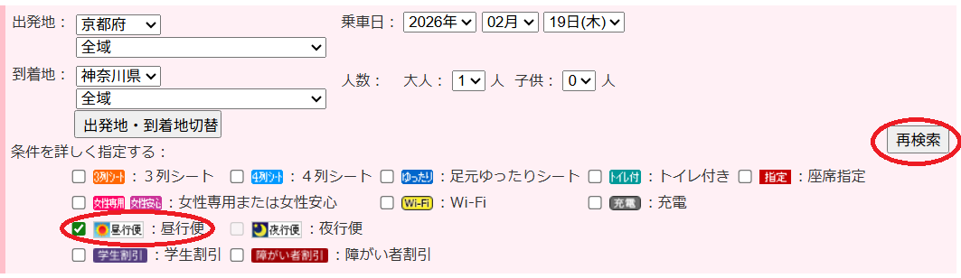 検索結果が表示されたら、絞り込み機能で「昼行便」にチェックを入れ、「再検索」します。