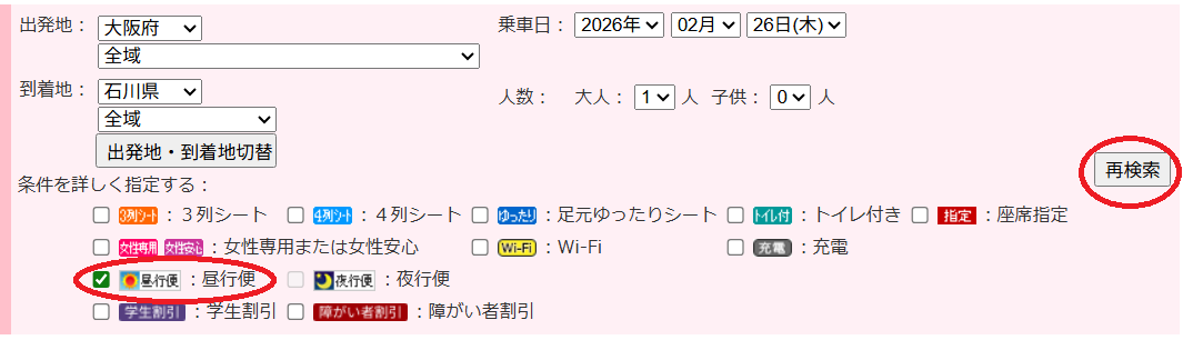 検索結果が表示されたら、絞り込み機能で「昼行便」にチェックを入れ、「再検索」します。