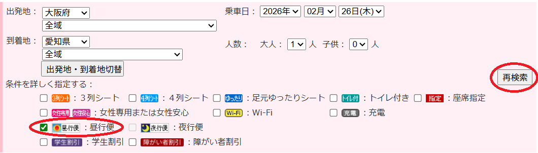 検索結果が表示されたら、絞り込み機能で「昼行便」にチェックを入れ、「再検索」します。