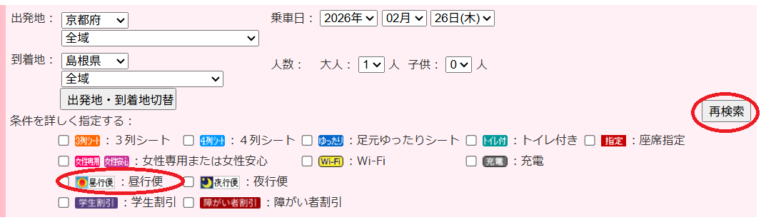 検索結果が表示されたら、絞り込み機能で「昼行便」にチェックを入れ、「再検索」します。