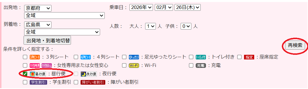 検索結果が表示されたら、絞り込み機能で「昼行便」にチェックを入れ、「再検索」します。
