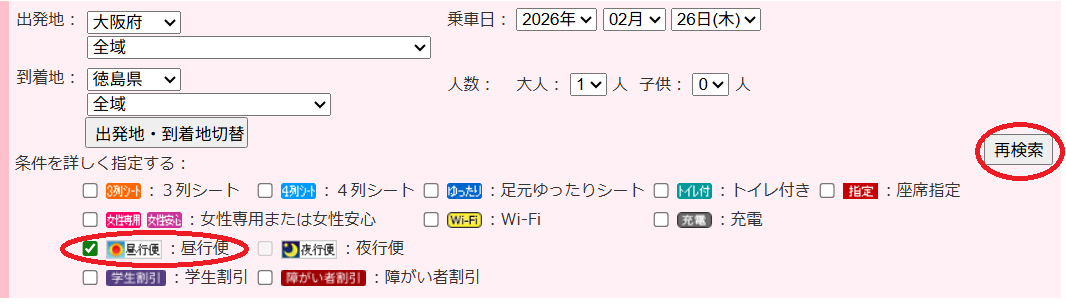 検索結果が表示されたら、絞り込み機能で「昼行便」にチェックを入れ、「再検索」します。